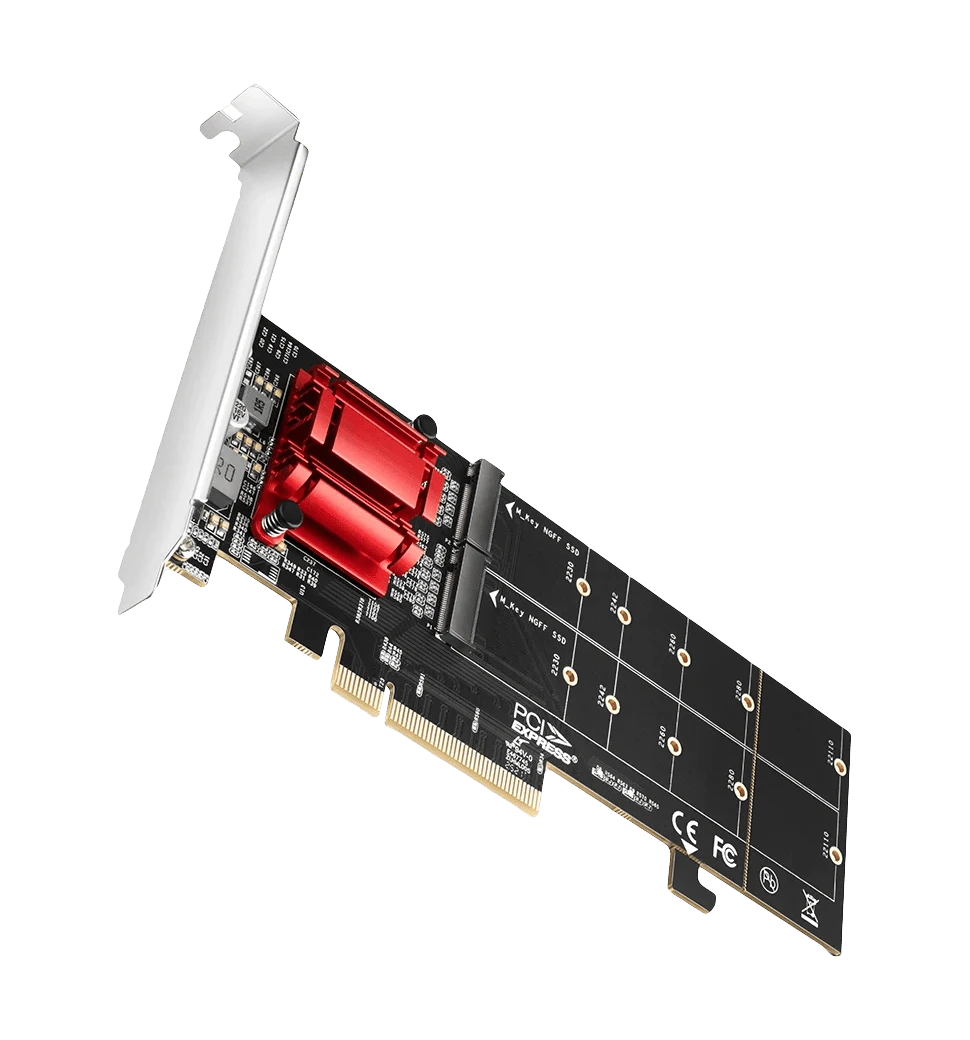 AXAGON PCEM2-ND — це PCI-Express x8 контролер/адаптер, який дозволяє підключити два NVMe M.2 SSD-накопичувачі до стандартного PCIe-слота вашого ПК. Цей адаптер стане у нагоді, якщо на материнській платі немає вільних слотів M.2, але є PCIe x8 або x16 слот, що дозволяє розширити можливості зберігання даних, підключивши два високошвидкісні NVMe SSD.