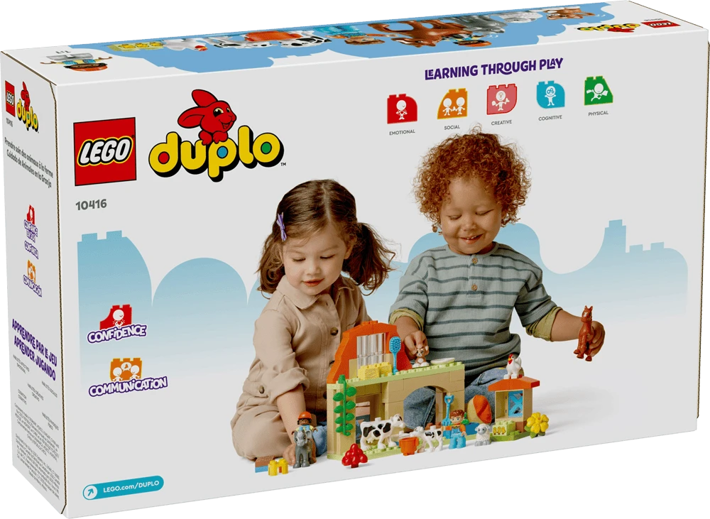 Набір LEGO DUPLO для малюків від 2 років. Вчить піклуватися про коня, вівцю, корову та курку. Велика модель ферми допомагає розвивати дрібну моторику та емпатію через гру. Яскраві безпечні деталі ідеально підходять для маленьких ручок майбутніх фермерів.