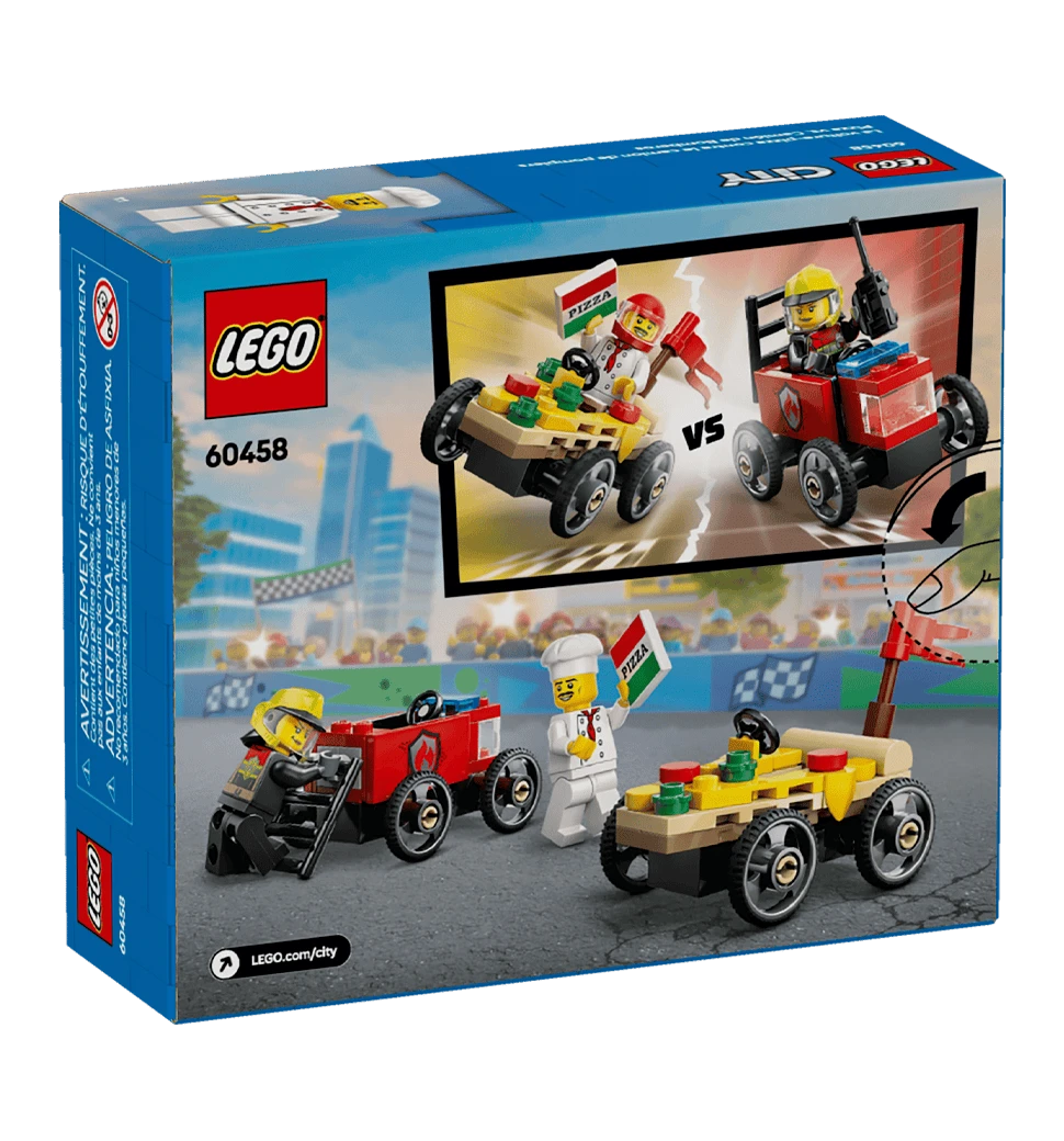 LEGO City Пицца - автомобиль против пожарной машины 60458 — это небольшой набор для гонок из 70 деталей для детей от 5 лет: он включает 2 болида — пицца - автомобиль и пожарную машину, а также 2 мини фигурки (шефа и пожарного). Дети могут строить модели, сажать героев в машины и устраивать увлекательные гонки, развивая воображение и моторные навыки.